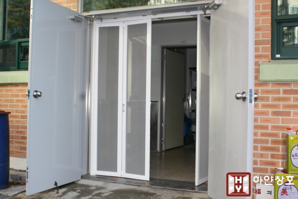 ¼®¼ºÃʵîÇб³ ±Þ½ÄÁ¶¸®½Ç¿¡ ¼³Ä¡ÇÑ 4Âʹ® ¾çÂʰ³Æó ¾ÈÀü¹æ¹ü¹æÃæ¸Á(¾ÈÀü¹æÃæ¸Á)ÀÔ´Ï´Ù.